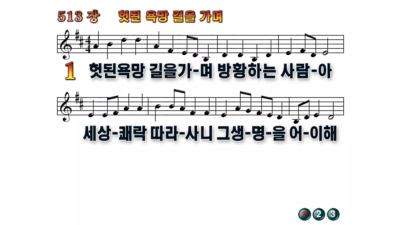 새찬송가 '513장 헛된 욕망길을 가며'의 16:9 와이드버전으로 편집된 배경 없는 새찬송가 PPT악보입니다.
