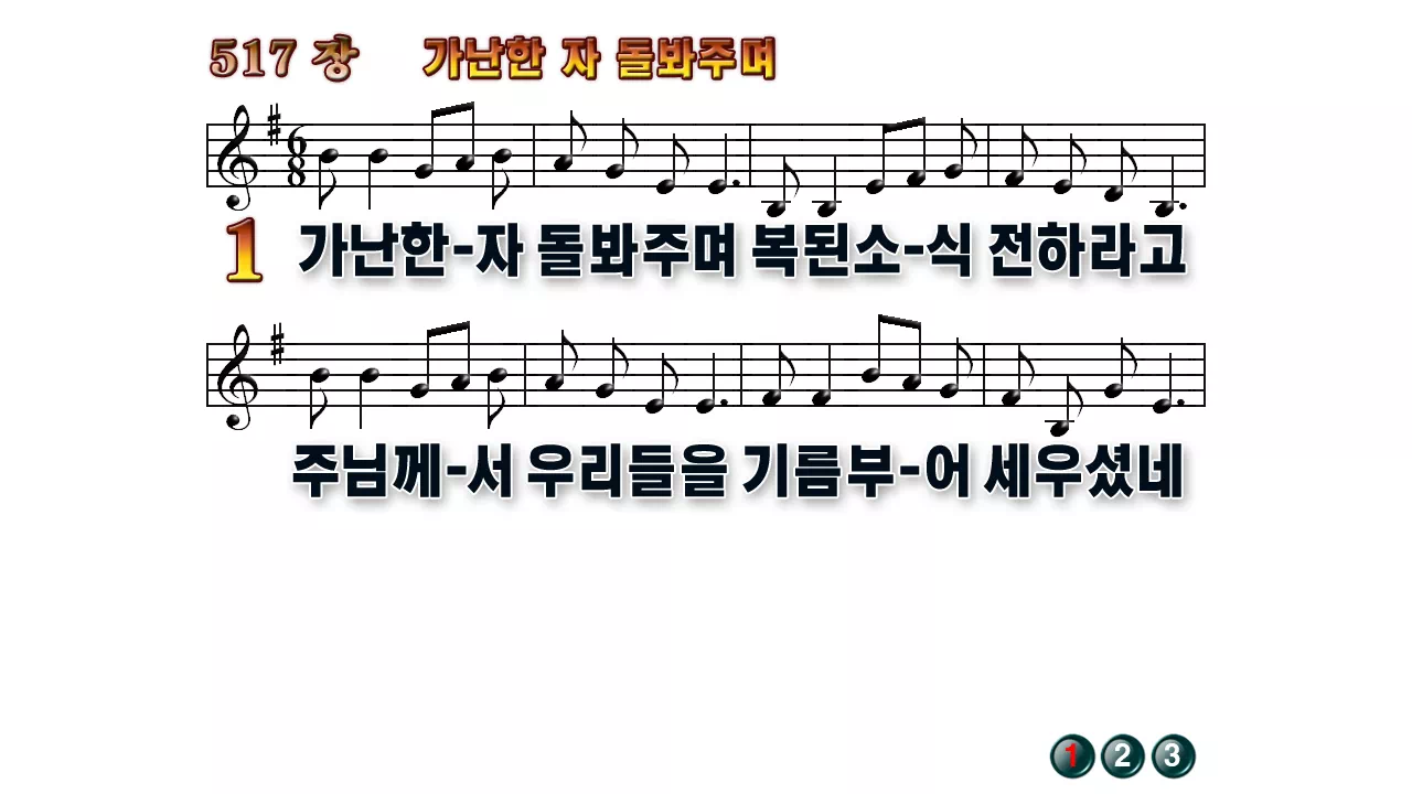 새찬송가 '517장 가난한 자 돌봐주며'16:9 와이드버전으로 편집된 배경 없는 새찬송가 PPT악보입니다.
