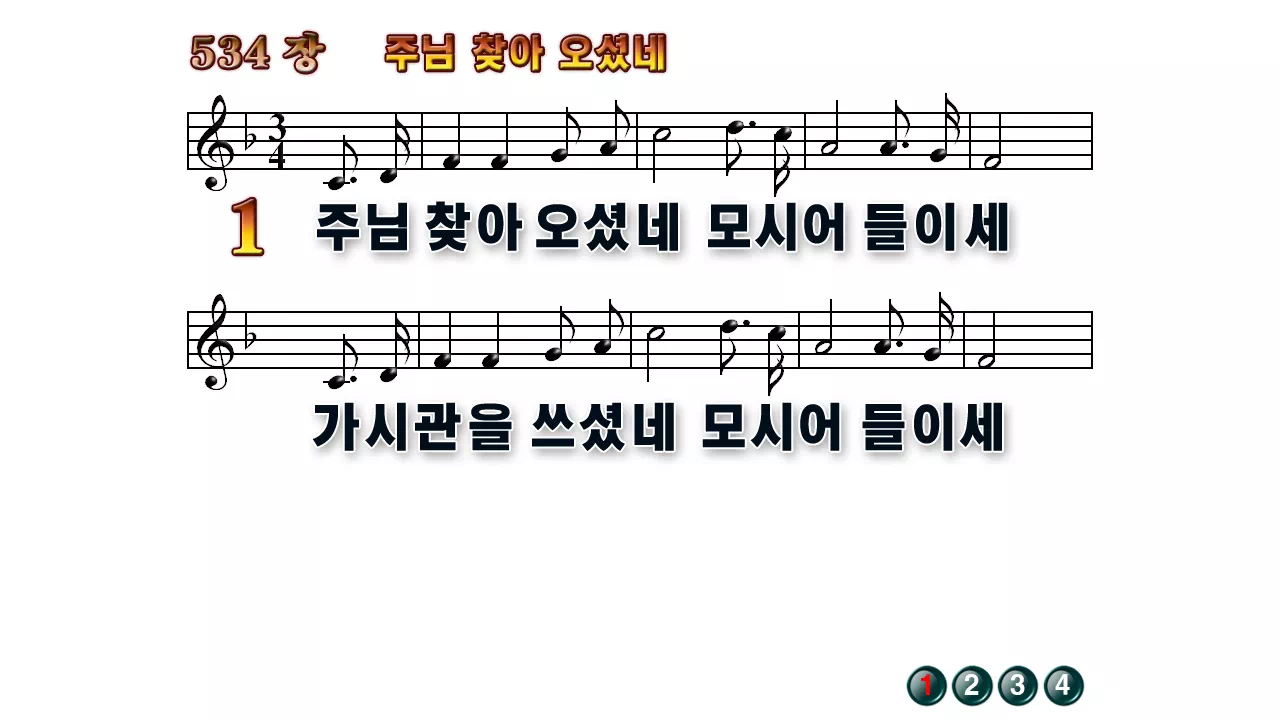 새찬송가 '534장 주님 찾아 오셨네'의 16:9 와이드버전으로 편집된 배경 없는 새찬송가 PPT악보입니다.