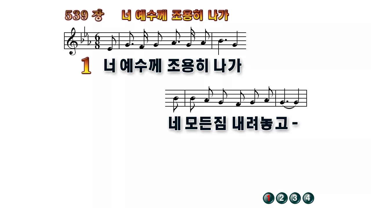 새찬송가 '539장 너 예수께 조용히 나가'의 16:9 와이드버전으로 편집된 배경 없는 새찬송가 PPT악보입니다.
