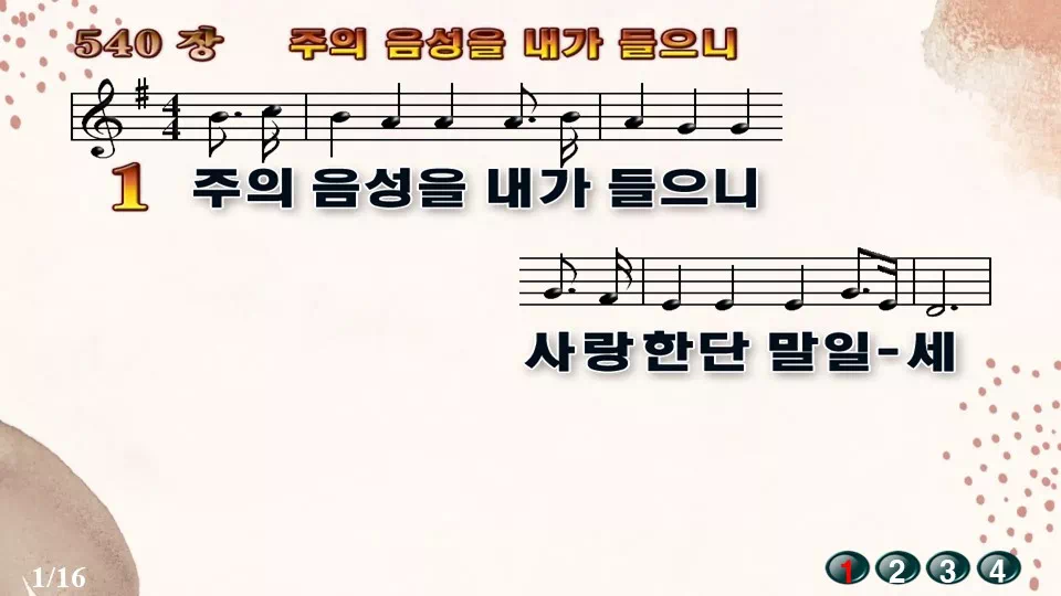새찬송가 '540장 주의 음성을 내가 들으니'16:9 와이드버전으로 편집된 새찬송가 PPT악보입니다.
