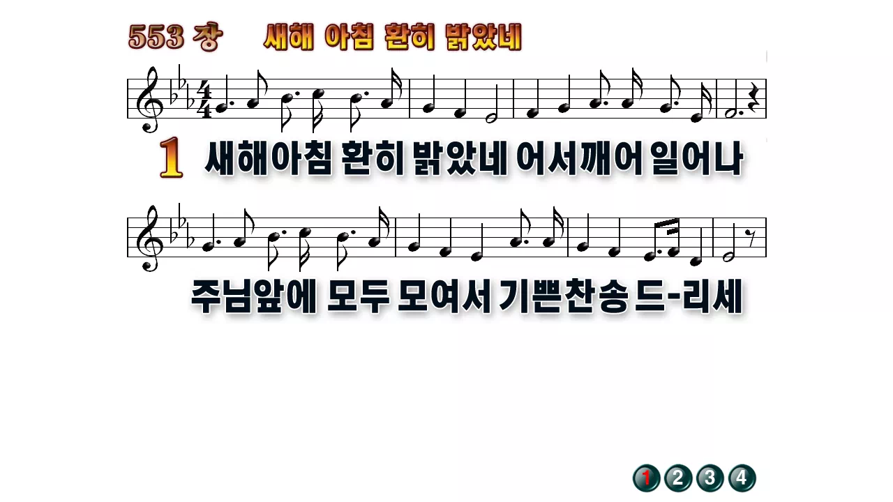 새찬송가 '553장 새해 아침 환히 밝았네'의 16:9 와이드버전으로 편집된 배경 없는 새찬송가 PPT악보입니다.