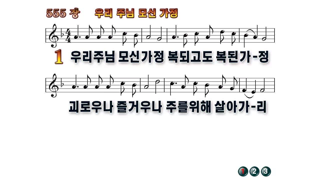 새찬송가 '555장 우리 주님 모신 가정'의 16:9 와이드버전으로 편집된 배경 없는 새찬송가 PPT악보입니다.