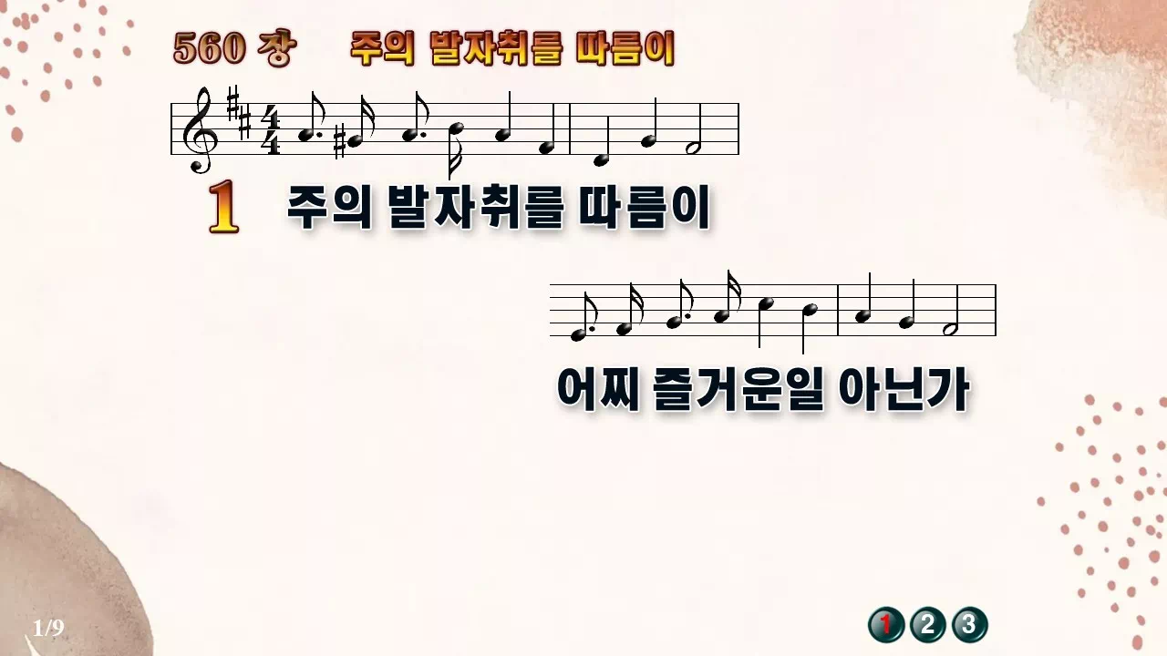 새찬송가 '560장 주의 발자취를 따름이'의 16:9 와이드버전으로 편집된 새찬송가 PPT악보입니다.