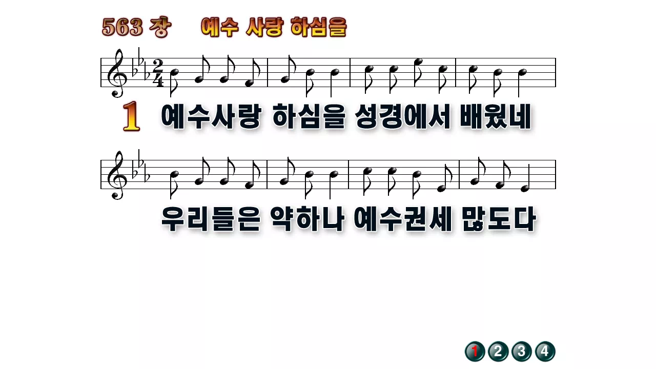새찬송가 '563장 예수 사랑하심을'16:9 와이드버전으로 편집된 배경 없는 새찬송가 PPT악보입니다.