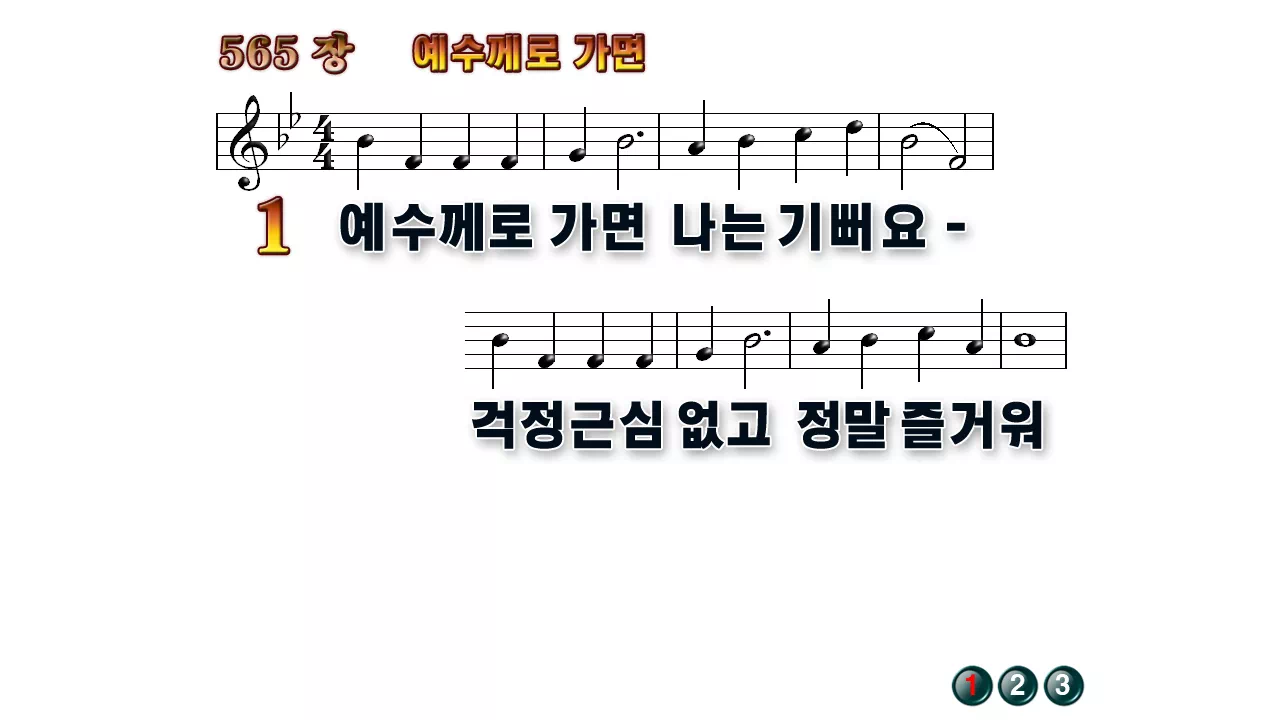 새찬송가 '565장 예수께로 가면'의 16:9 와이드버전으로 편집된 배경 없는 새찬송가 PPT악보입니다.