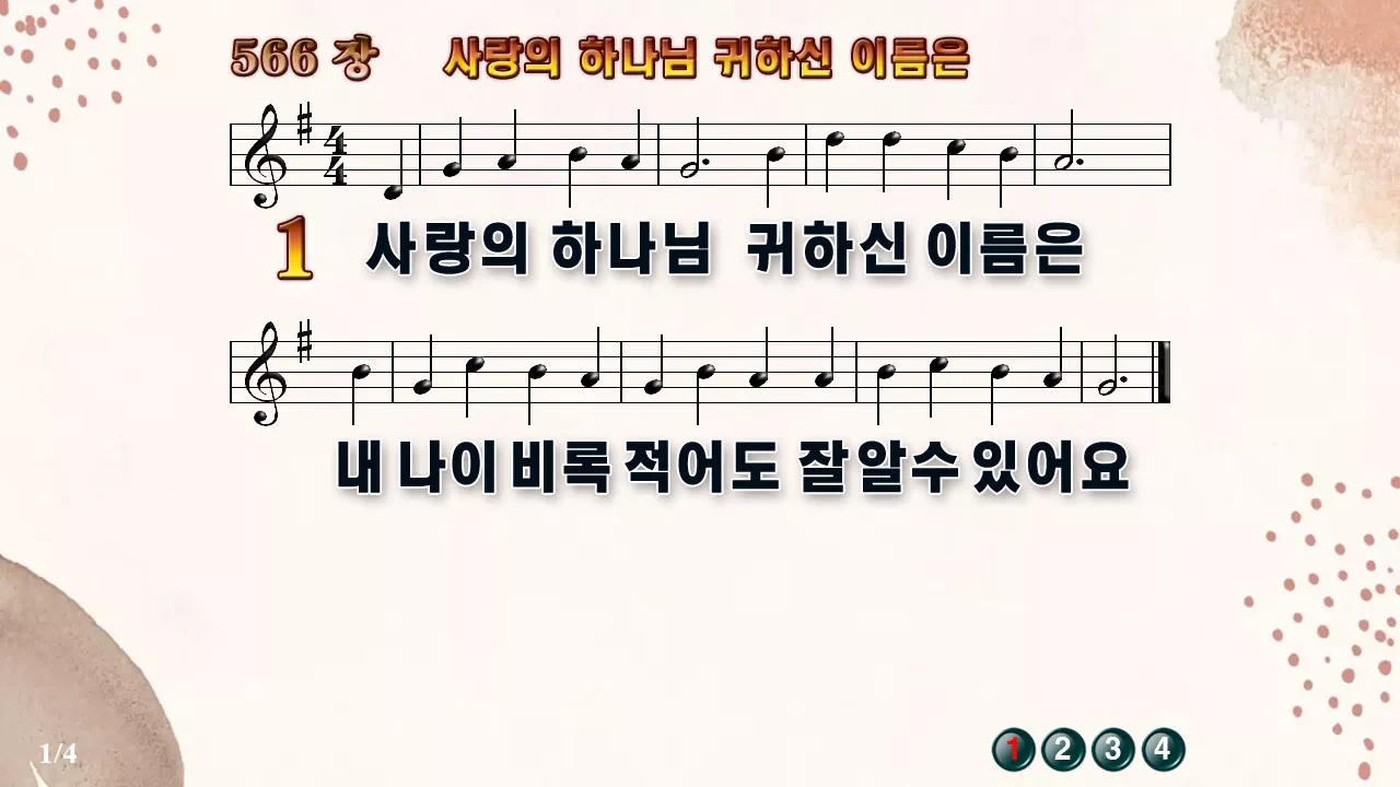 새찬송가 '566장 사랑의 하나님 귀하신 이름은'의 16:9 와이드버전으로 편집된 새찬송가 PPT악보입니다.