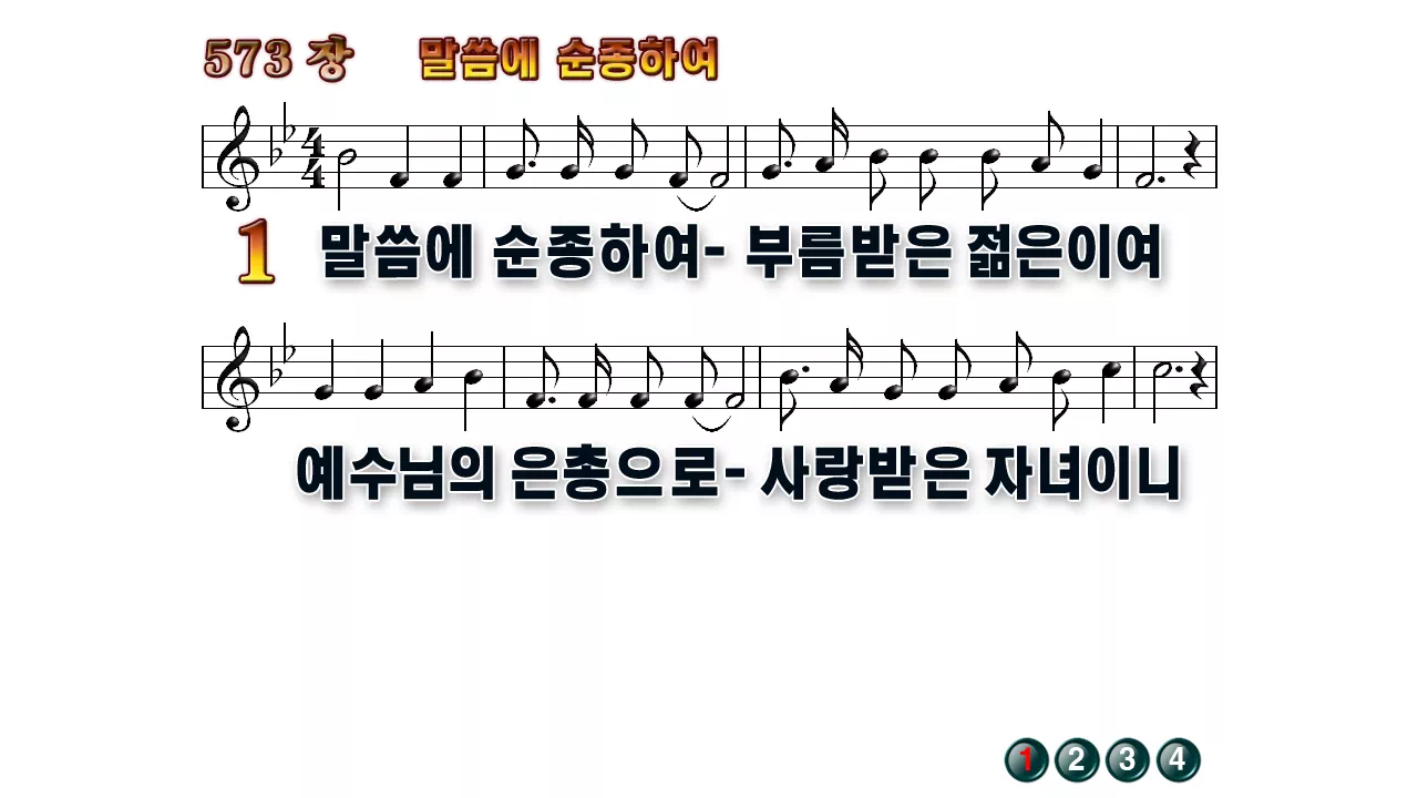 새찬송가 '573장 말씀에 순종하여'의 16:9 와이드버전으로 편집된 배경 없는 새찬송가 PPT악보입니다.