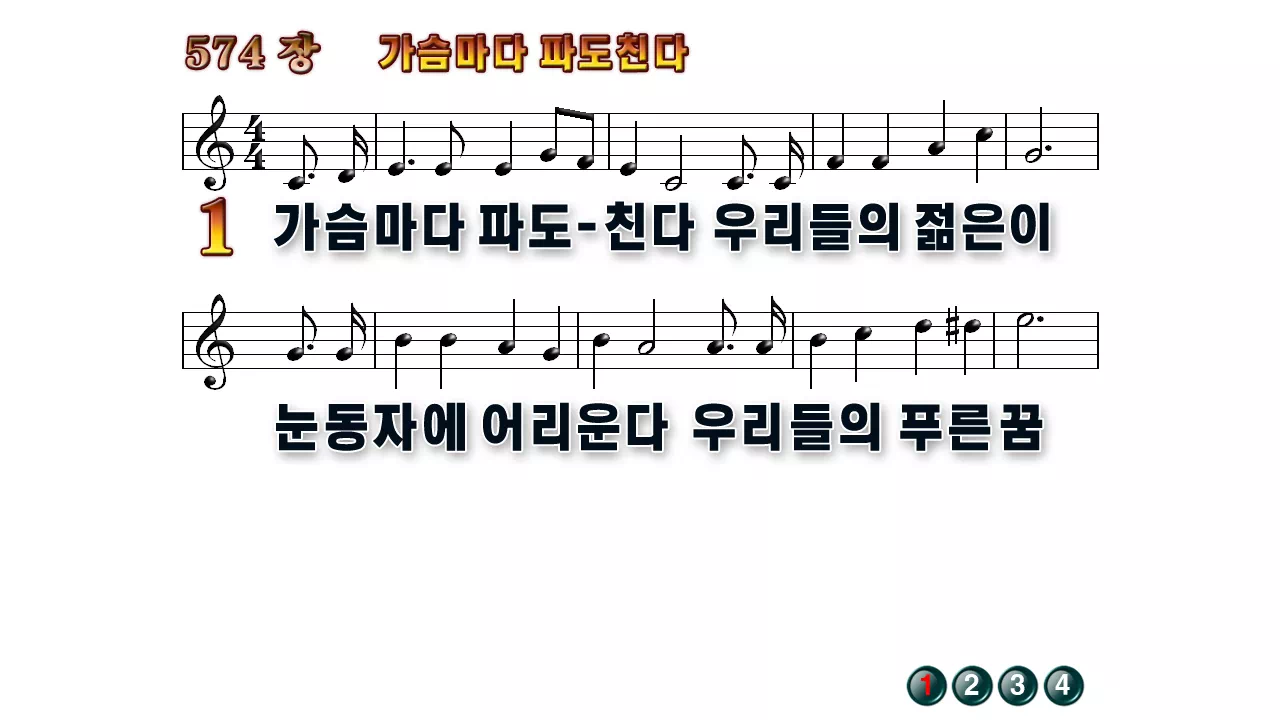 새찬송가 '574장 가슴마다 파도친다'의 16:9 와이드버전으로 편집된 배경 없는 새찬송가 PPT악보입니다.