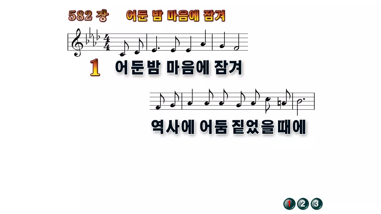 새찬송가 '582장 어둔밤 마음에 잠겨'의 16:9 와이드버전으로 편집된 배경 없는 새찬송가 PPT악보입니다.