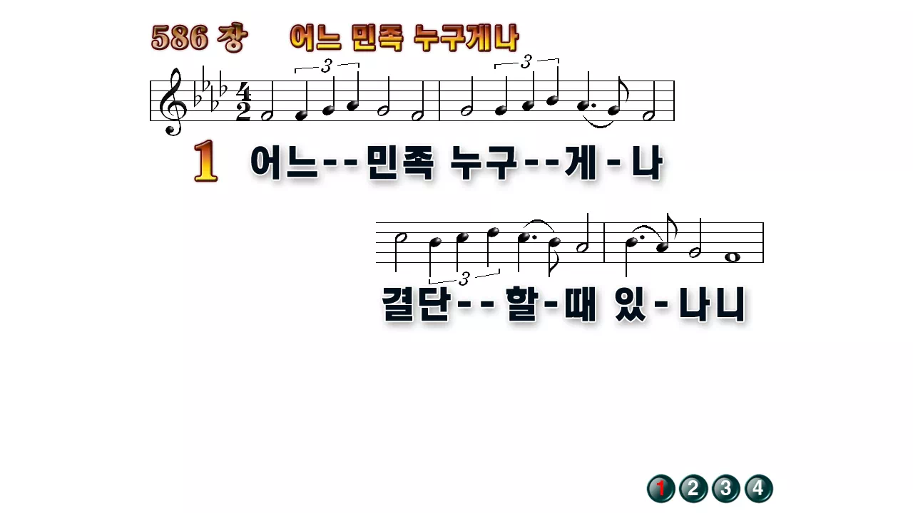 새찬송가 '586장 어느 민족 누구게나'의 16:9 와이드버전으로 편집된 배경 없는 새찬송가 PPT악보입니다.