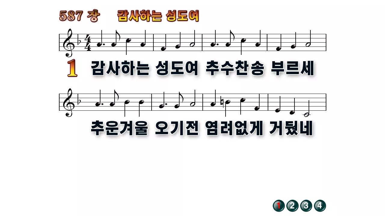새찬송가 '587장 감사하는 성도여'의 16:9 와이드버전으로 편집된 배경 없는 새찬송가 PPT악보입니다.