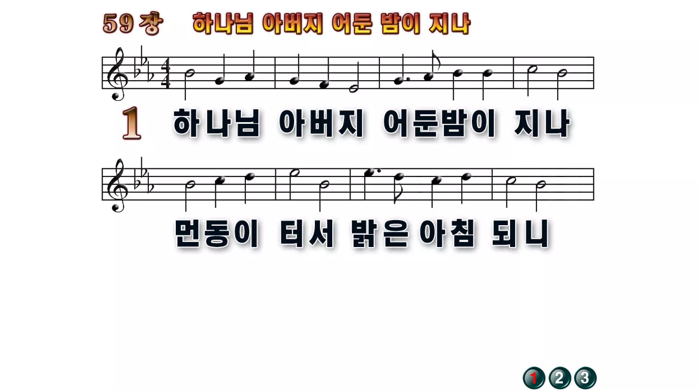 새찬송가 '59장 하나님 아버지 어둔 밤이 지나'의 16:9 와이드버전으로 편집된 배경 없는 새찬송가 PPT악보입니다.