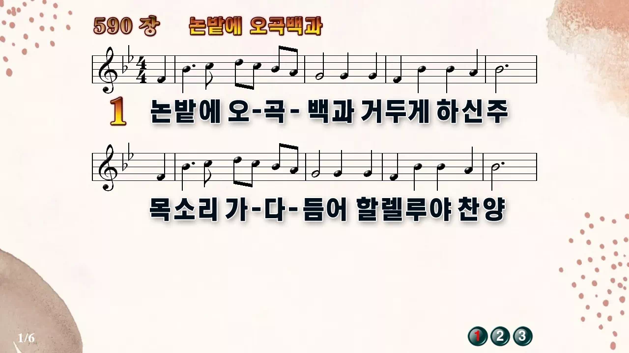 새찬송가 '590장 논밭에 오곡백과'의 16:9 와이드버전으로 편집된 새찬송가 PPT악보입니다.