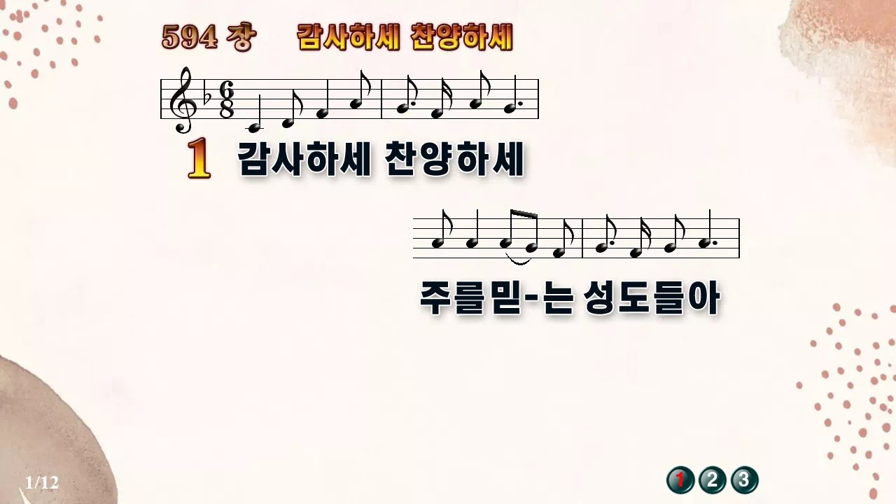 새찬송가 '594장 감사하세 찬양하세'의 16:9 와이드버전으로 편집된 새찬송가 PPT악보입니다.