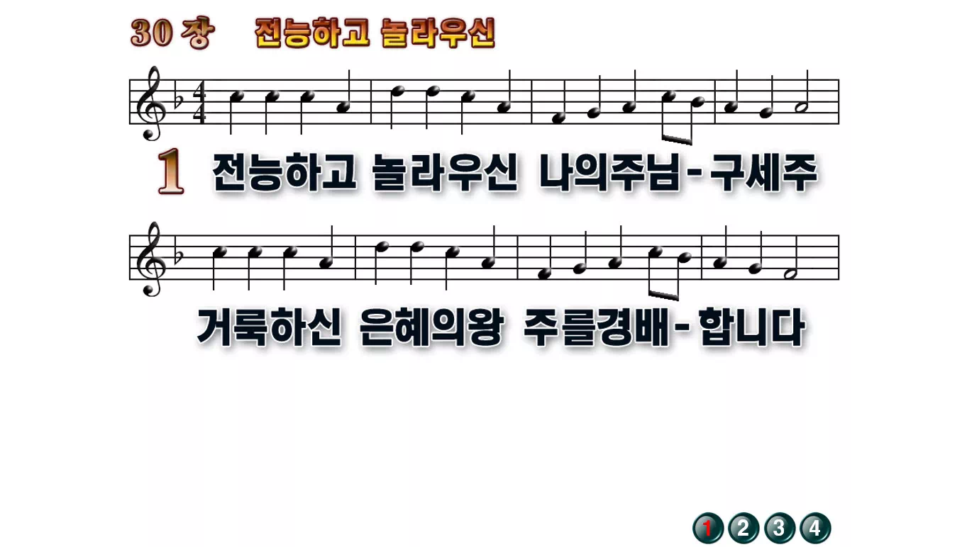 새찬송가 '30장 전능하고 놀라우신'의 16:9 와이드버전으로 편집된 배경 없는 새찬송가 PPT악보입니다.