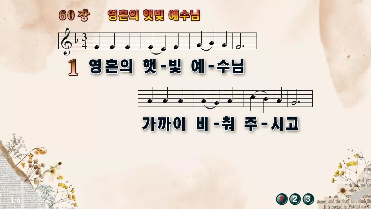 새찬송가 '60장 영혼의 햇빛 예수님'의 16:9 와이드버전으로 편집된 새찬송가 PPT악보입니다.