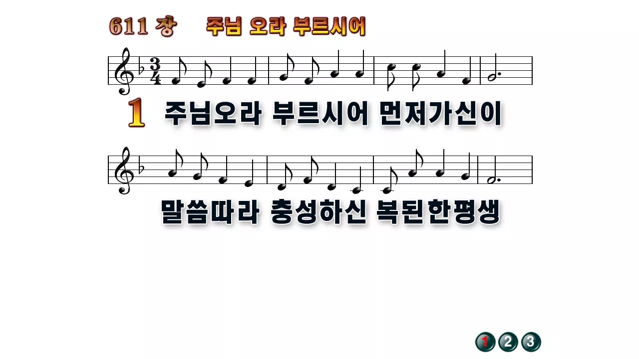 새찬송가 '611장 주님오라 부르시어'의 16:9 와이드버전으로 편집된 배경 없는 새찬송가 PPT악보입니다.