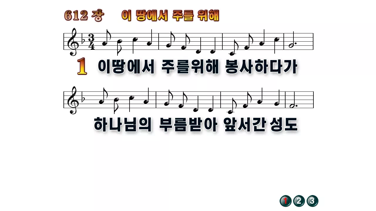 새찬송가 '612장 이땅에서 주를 위해'의 16:9 와이드버전으로 편집된 배경 없는 새찬송가 PPT악보입니다.