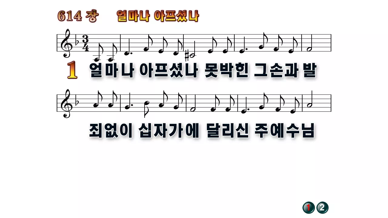 새찬송가 '614장 얼마나 아프셨나'의 16:9 와이드버전으로 편집된 배경 없는 새찬송가 PPT악보입니다.