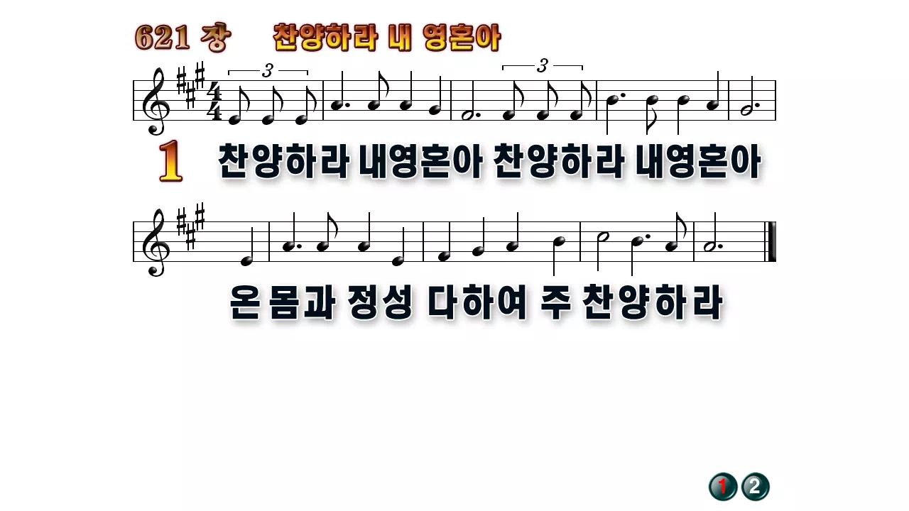 새찬송가 '621장 찬양하라 내 영혼아'16:9 와이드버전으로 편집된 배경 없는 새찬송가 PPT악보입니다.