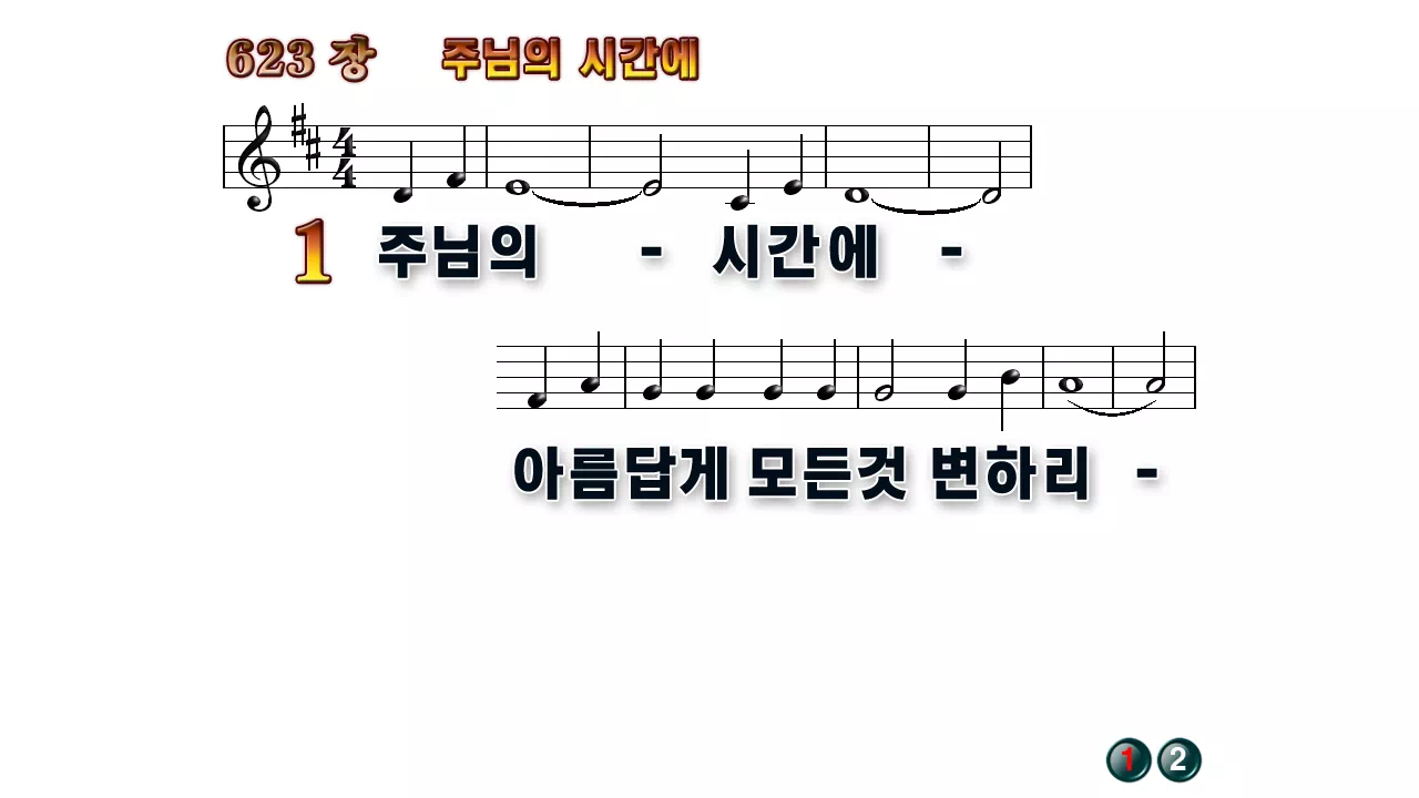 새찬송가 '623장 주님의 시간에'의 16:9 와이드버전으로 편집된 배경 없는 새찬송가 PPT악보입니다.
