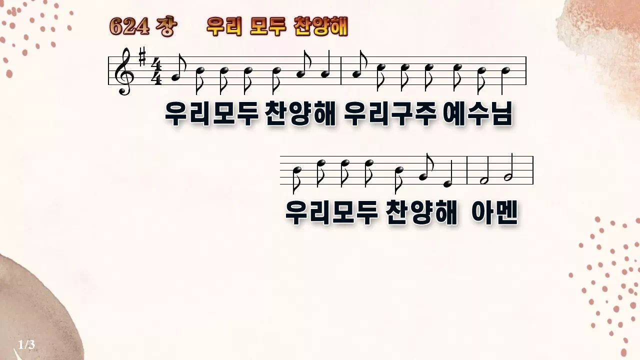 새찬송가 '624장 우리 모두 찬양해'의 16:9 와이드버전으로 편집된 새찬송가 PPT악보입니다.
