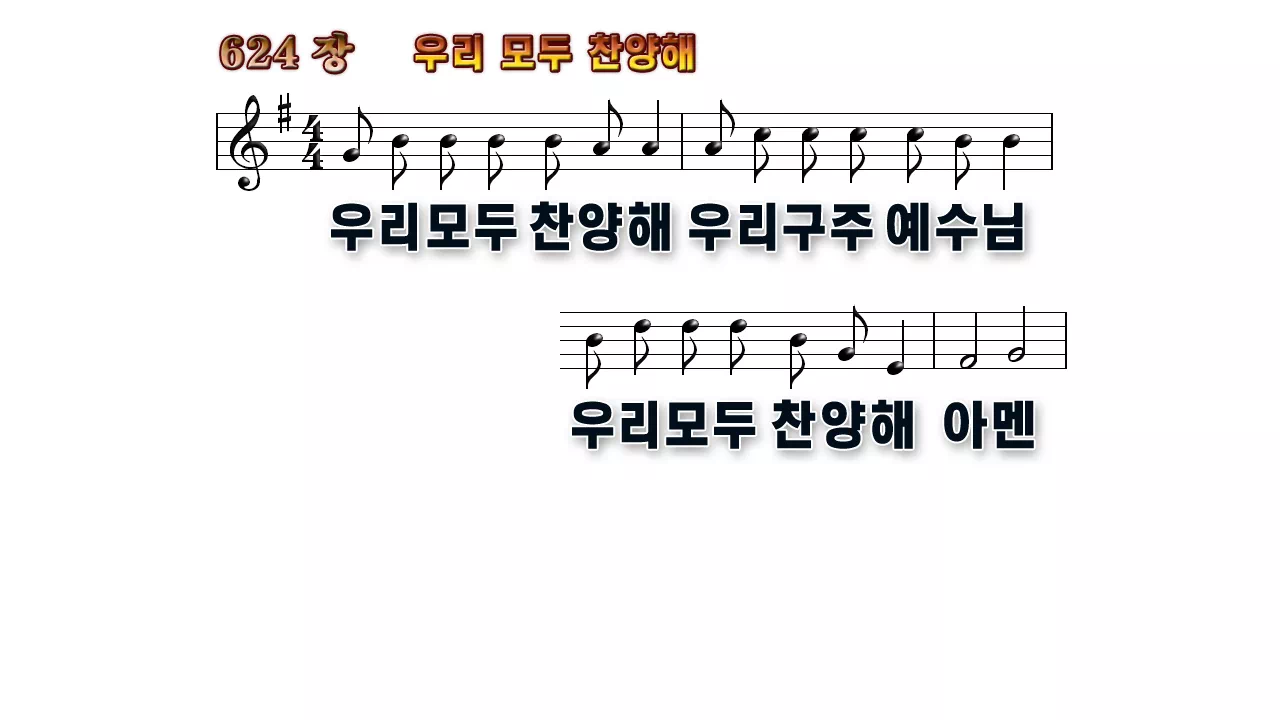 새찬송가 '624장 우리 모두 찬양해'의 16:9 와이드버전으로 편집된 배경 없는 새찬송가 PPT악보입니다.