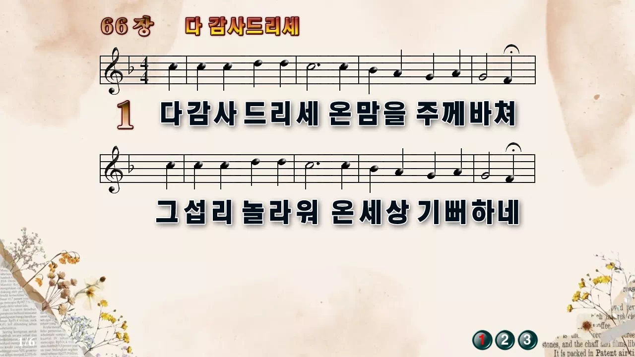 새찬송가 '66장 다 감사드리세'의 16:9 와이드버전으로 편집된 새찬송가 PPT악보입니다.