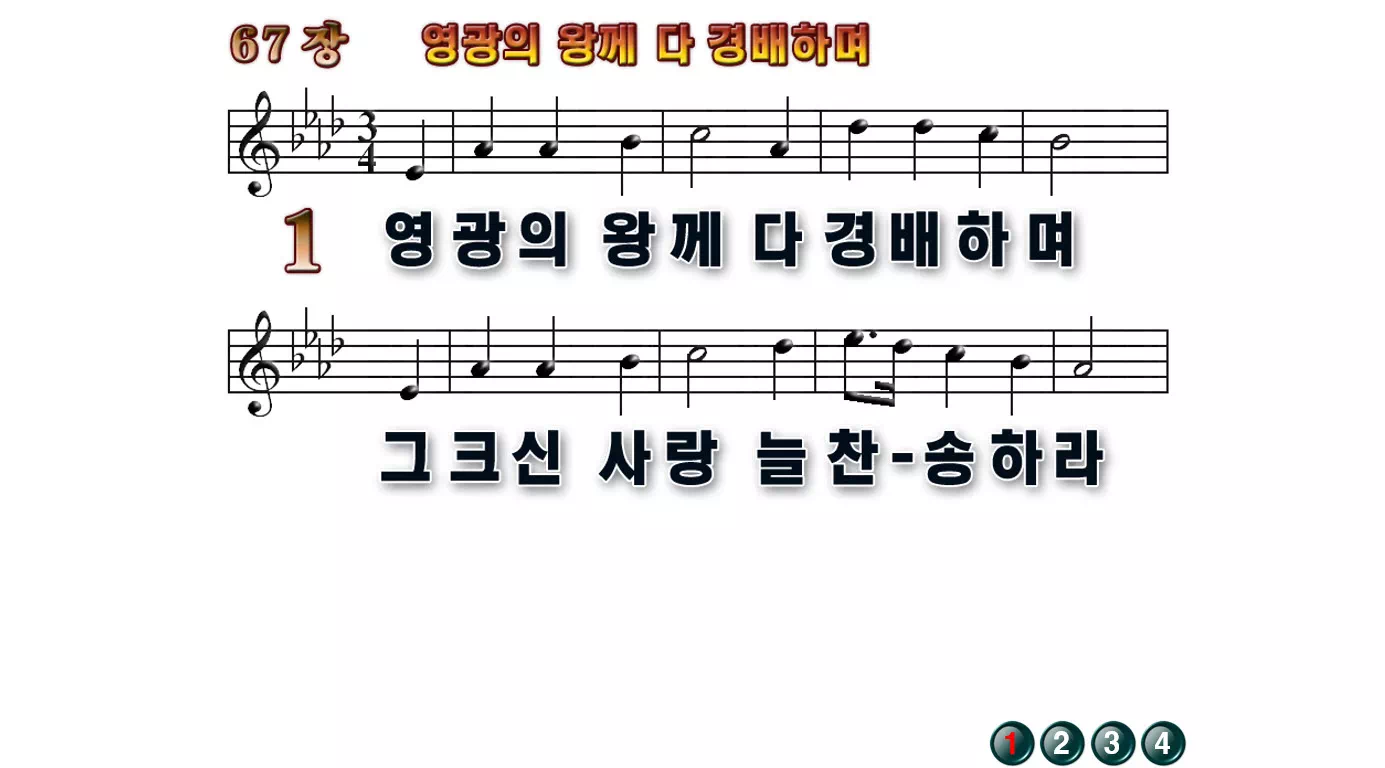새찬송가 '67장 영광의 왕께 다 경배하며'의 16:9 와이드버전으로 편집된 배경 없는 새찬송가 PPT악보입니다.