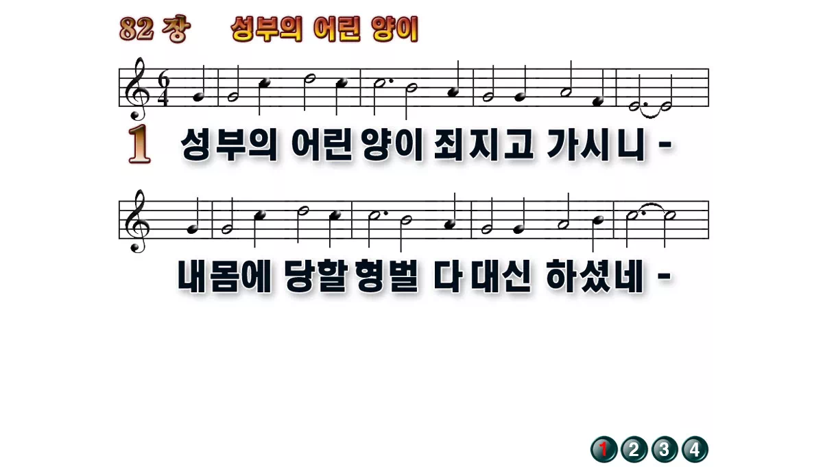 새찬송가 '82장 성부의 어린 양이'의 16:9 와이드버전으로 편집된 배경 없는 새찬송가 PPT악보입니다.
