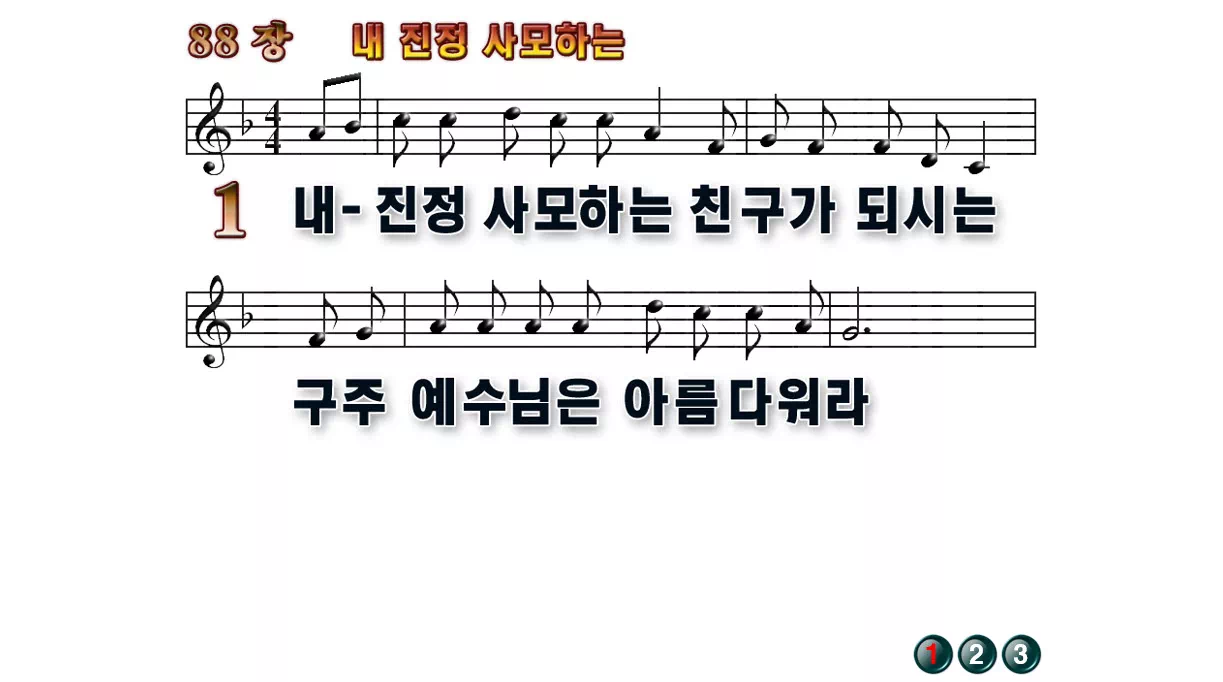 새찬송가 '88장 내 진정 사모하는'의 16:9 와이드버전으로 편집된 배경 없는 새찬송가 PPT악보입니다.