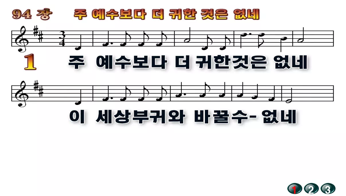 새찬송가 '94장 주 예수보다 더 귀한 것은 없네'16:9 와이드버전으로 편집된 배경 없는 새찬송가 PPT악보입니다.