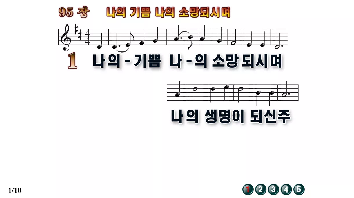 새찬송가 '95장 나의 기쁨 나의 소망 되시며'의 16:9 와이드버전으로 편집된 배경 없는 새찬송가 PPT악보입니다.