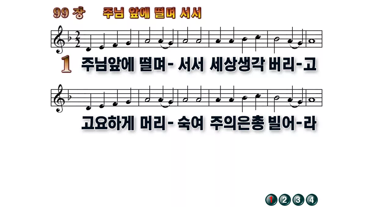 새찬송가 '99장 주님 앞에 떨며 서서'의 16:9 와이드버전으로 편집된 배경 없는 새찬송가 PPT악보입니다.